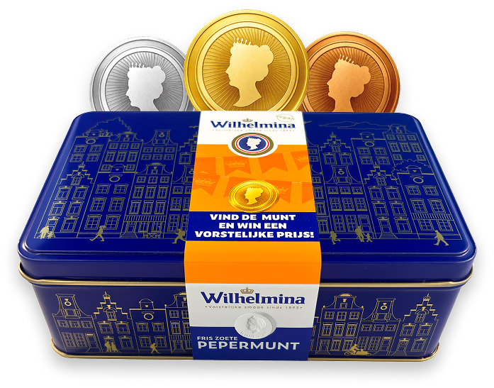 Koop een unieke actieverpakking Wilhelmina pepermunt bij Poiesz en wie weet vind jij een gouden, zilveren of bronzen munt in jouw verpakking. Met zo'n munt maak je direct kans op een van onze vorstelijke prijzen, zoals een luxe weekend bij Landgoed Lauswolt, een diner voor twee bij KB Food & Drinks in Dokkum of een heerlijk verwenpakket.